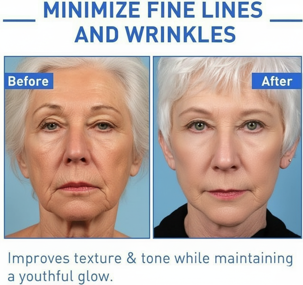 Get Glowing and Younger Face: Our Serum Promises to smooth out forehead creases, smile lines, and other signs of aging.Emphasis on giving skin a plumper, more youthful appearance via moisture and improved texture